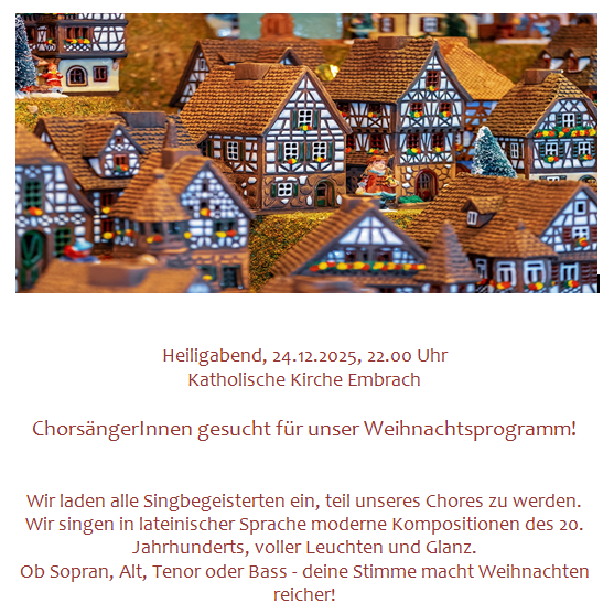 An Weihnachten, sangen wir in der katholischen Kirche Embrach die Pastoralmesse in G, Opus 24 (Lebkuchenmesse) von Karl Kempter, eine wohlklingende lateinische Messe aus Süddeutschland. Der Applaus und zahlreiche lobende Worte zeigten einmal mehr, dass unser Beitrag sehr geschätzt wird.